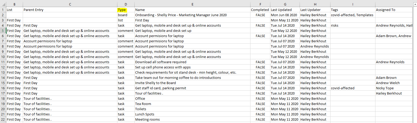 The contents of your board will be exported and downloaded to a CSV file. Take note of the TYPE column in the file. This will tell you if you are looking at the Board, a list, a task (card) or a comment.